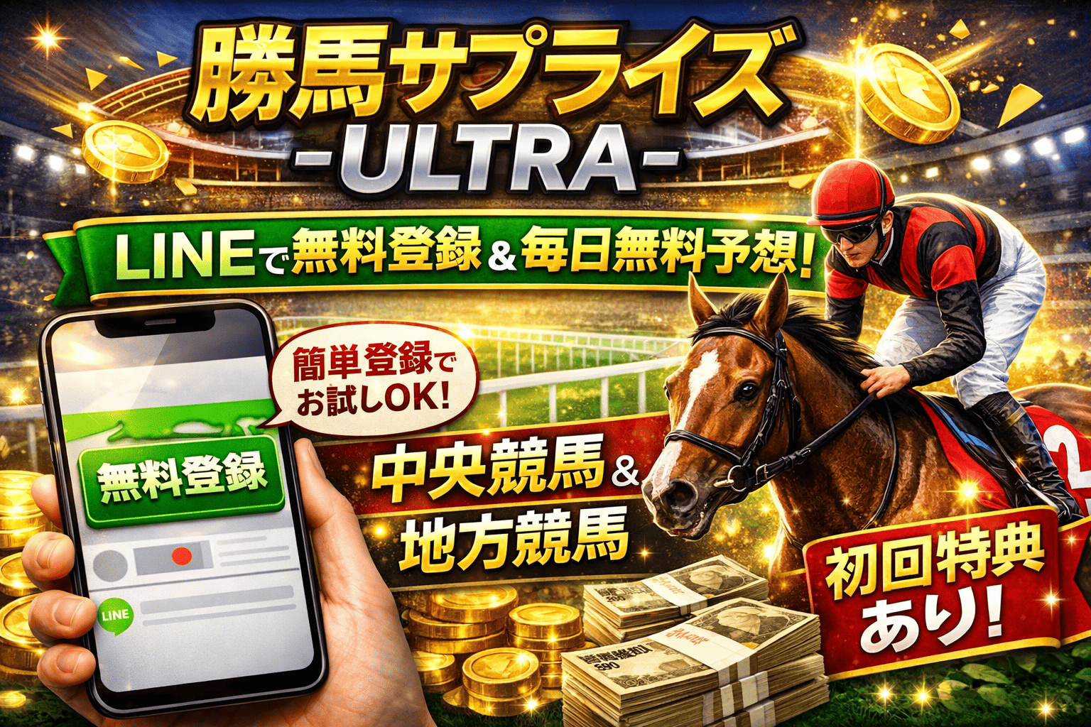 勝馬サプライズ-ULTRA-は、LINEで無料登録できる競馬予想サイトとして紹介されており、無料予想をまず試せること、登録の手軽さ、初回特典、口コミ評価などを確認しやすいサイトです。